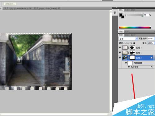 选择六尺巷图层,执行图层-智能对象-转换为智能对象命令,然后再执行滤镜-模糊-高斯模糊命令,并设置半径为2,