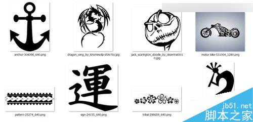 我们准备的图案都是非常简单的,即使是新手都会觉得可以处理好。同时我们还要保证这些图案的分辨率足够高,但当然有些会例外,因为很少纹身图案足够清晰。所以尺寸OK就可以,只要保证边缘没有锯齿就可以啦。如果图案自带阿尔法通道或者蒙版就最好,但我们都会对这些图案应用正片叠加的混合图层选项,所以这不是难事。