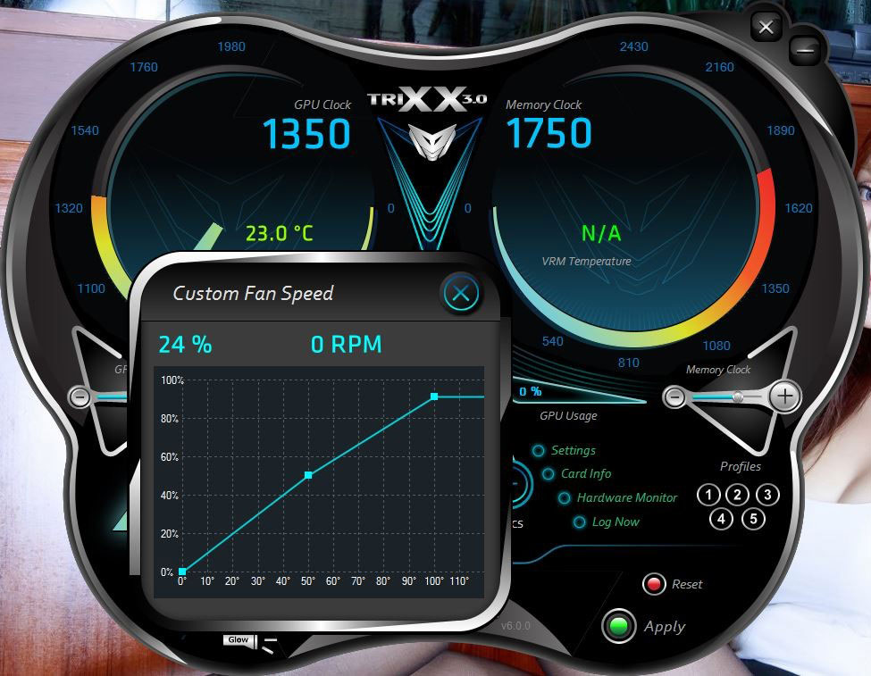 超频用蓝宝石的TRI XX最新版,比进BIOS超频方便一点,之前在朋友家的平台上用映泰主板超到了1400M,结果回来换了我的平台就死活超不上去了,不知道是不是因为电源太渣,算了,勉强超到1350M玩玩吧,找个时间把问题排除一下再重新买。