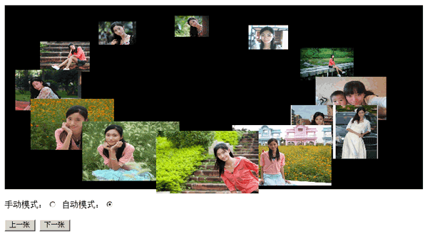 1.支持自动和手动两种模式:自动模式下自动旋转展示,手动模式下通过鼠标选择当前图片,或通过提供的接口选择上一张/下一张图片。