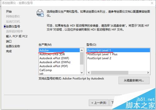 5、在“绘图仪型号”中,生产商选择”Adobe" 型号选择“Postscript Level 1”