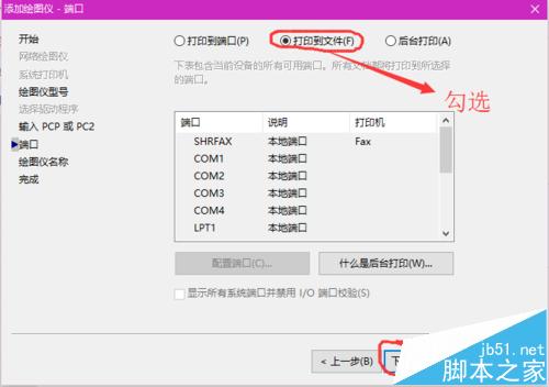 7、在“端口”中,勾选“打印到文件”,点击“下一步”