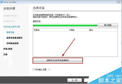2、在选择设备界面,点击下方的“如果您无法发现设备清单请点击”,在选择搜索方式界面选择“指定设备IP地址”,然后点击下一步