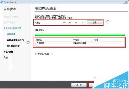 3、在通过IP地址搜索界面输入打印机IP地址,例如:192.168.27.210 ,点击搜索,搜索完成后选择MP C3004后点击下一步