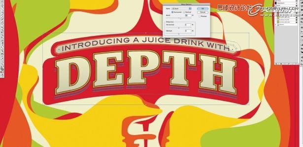把标志PNG给拖进来,然后在后面加入个背景(路径>扭曲>拱行,弧度15%). To frame the type, I’ve added a curved banner behind it (Effect>Warp>Arch, with Bend set to 15%),在标签的上方和下方做两个曲线,使他们和整体有联系,就好比液体一样。 这样的元素链接会更有效果,如果没有上下链接的画会觉得很突兀,缺乏整体感了。