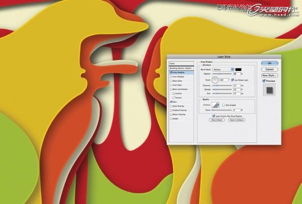 12 .到这里会话的阶段就算结束了。然后我们要打造剪纸叠加的那种效果了。尽管AI能够给他们添加一些阴影,也能达到效果。但是我更乐意使用PS来打造。将不同的图形,复制粘贴如PS中变成不同的层。