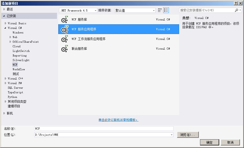 第一步:创建WCF服务应用程序项目WCF。