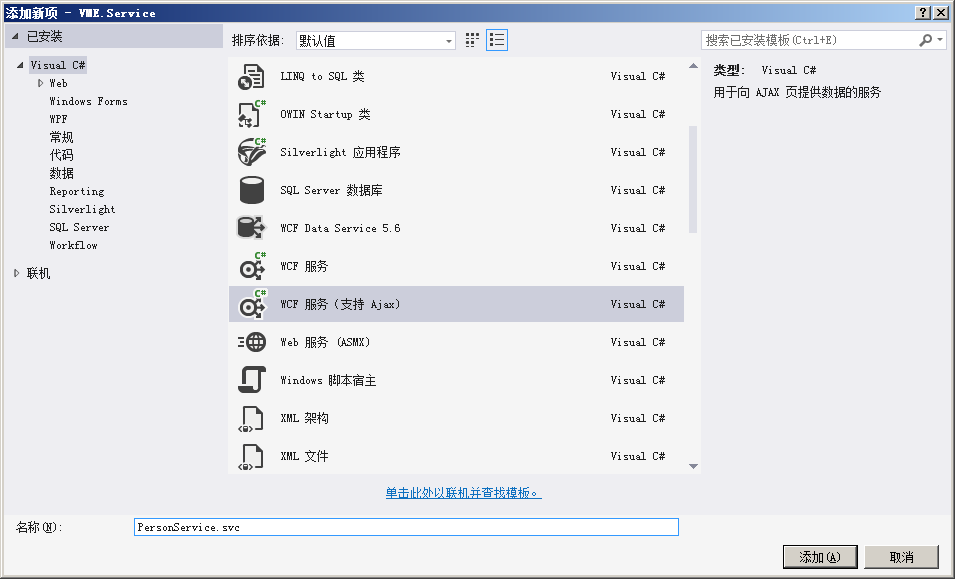 由于我的服务需要支持Ajax,所以选择“WCF服务(支持Ajax)”一项,具体代码如下: