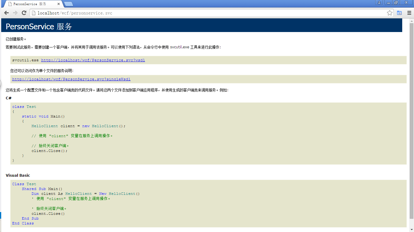1、现在可以通过浏览器访问http://localhost/wcf/personservice.svc来确认服务器端是否部署成功,出现如下界面说明部署成功。