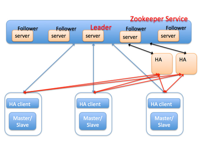 从前面的讨论可以看到,无论是keepalived方案还是MHA方案,都无法解决HA软件自身的高可用问题,因为HA本身是单点。那么如果将HA也引入多个副本呢?那么又带来新的问题,1.HA软件之间如何保证强同步。2.如何确保不会有多个HA同时进行切换动作。这两个问题实质都分布式系统一致性问题,为此,可以为HA软件引入类似Paxos,Raft这样的分布式一致性协议,保证HA软件的可用性。zooKeeper是一个典型的发布/订阅模式的分布式数据管理与协调框架,通过zookeeper中丰富的数据节点类型进行交叉使用,配合watcher事件通知机制,可以方便地构建一系列分布式应用涉及的核心功能,比如:数据发布/订阅,负载均衡,分布式协调/通知,集群管理,Master选举,分布式锁和分布式队列等。zookeeper是一个很大话题,大家可以google去找更多的信息,我这里主要讨论zookeeper如何解决HA自身可用性问题。架构图如下: