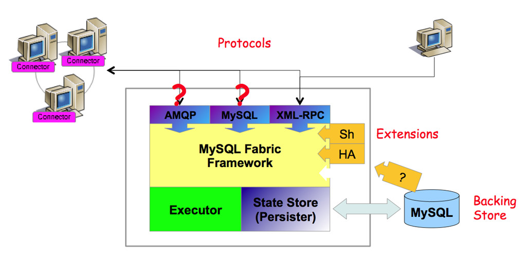 准确地来说,中间件与高可用没有特别大的关系,因为切换都是在数据库层完成,但引入中间层后,使得对应用更透明。在引入中间件之前,所有的方案,基本都依赖于VIP漂移机制,或者不依赖于VIP又不能保证对应用透明。通过加入中间件层,可以同时实现对应用透明和高可用。此外中间层还可以做sharding,方便写扩展。proxy的方案很多,比如mysql自带的mysql-proxy和fabric,阿里巴巴的cobar和tddl等。我们以fabric为例,其架构图如下: