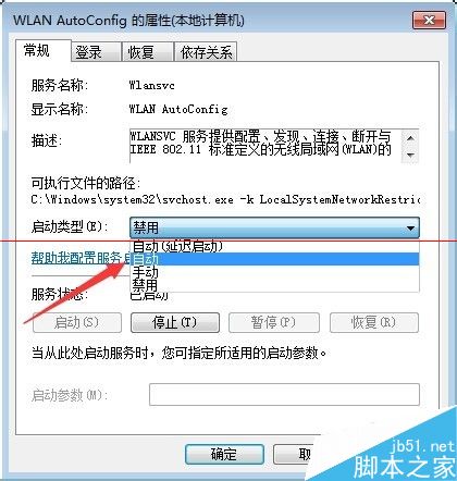 5、在“常规”选项卡中找到“启动类型”中选择“自动”。这样,再开机的时候就会自动搜索无线网络。