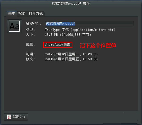 2、然后,在字体文件属性中找到该字体文件的位置,将它记下来,最后关闭属性窗口。