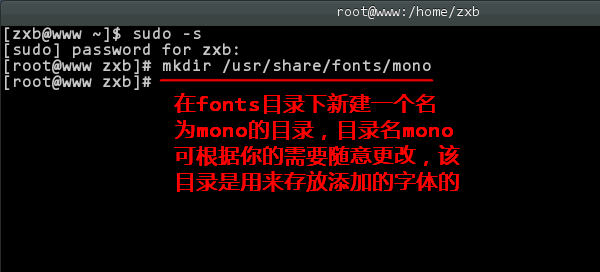 3、使用 mkdir 命令在 /usr/share/fonts 目录下新建一个文件夹,该文件夹用来存放我们要添加的字体文件。文件夹的名称可自拟,比如我这里取名为 mono。