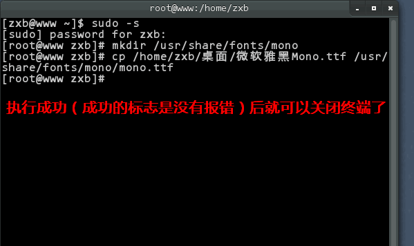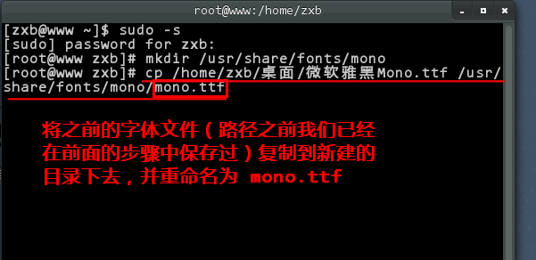 4、再使用 cp 命令将字体文件复制到新建的文件夹下。注意,最后一项是复制后的文件副本名称,可以与原字体文件名不同(但扩展名一定要相同),我这里是 mono.ttf。
