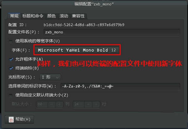 2、当然,我们也可以更改终端的配置文件,将终端字体设为我们新添加的字体。