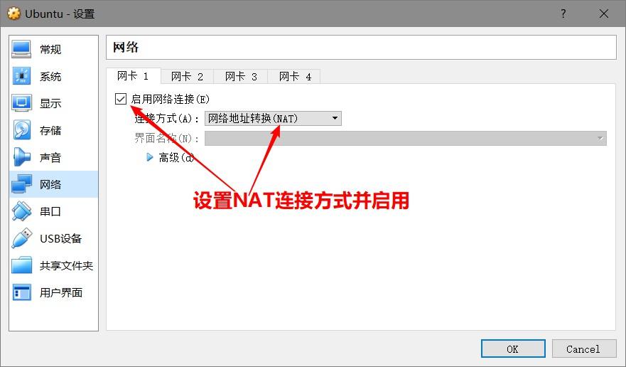网络-网卡1 > 启用网络连接 > 选择NAT连接方式 > 即可完成基本配置