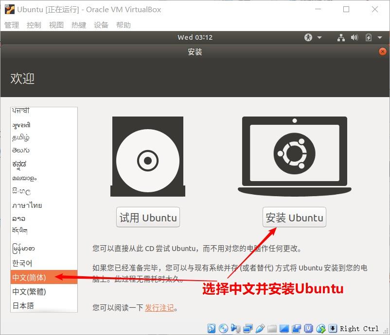 点击启动按钮 > 开始安装向导> 选择中文 > 点击安装Ubuntu