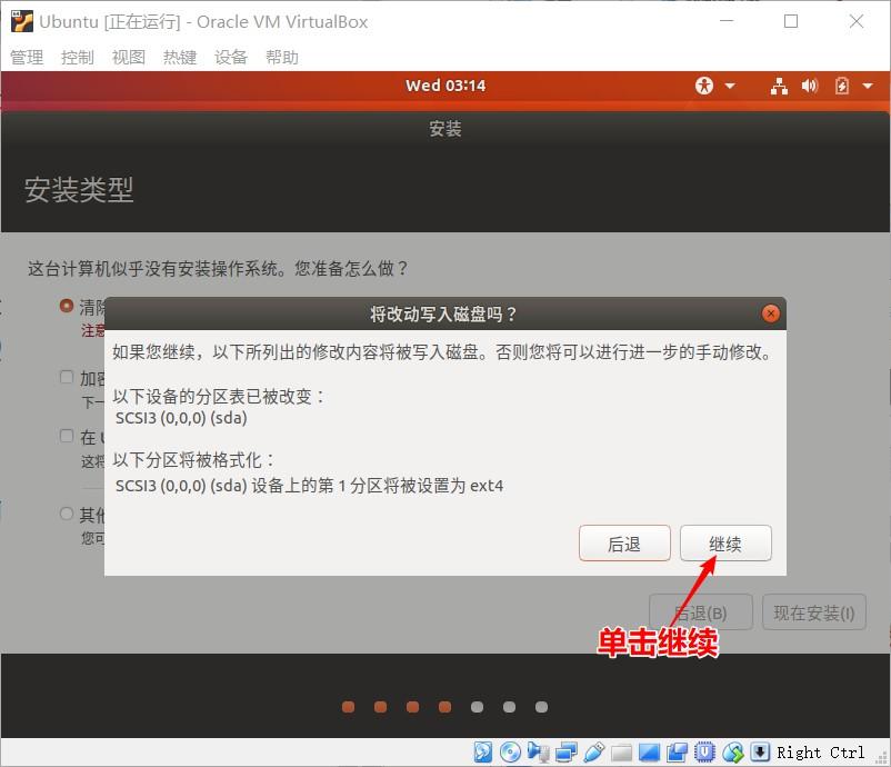 选择清除整个磁盘并安装Ubuntu > 单击继续