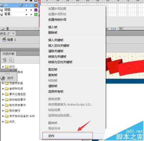 6、再AS层第一帧单击右键,选择动作,在里面就可以编写AS代码实现交互啦