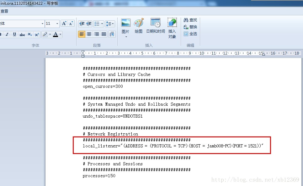 2.用写字板的方式打开它,找到local_listener,然后将它的值换掉(原始值叫LISTENER_ORCL),换成你tnsnames.ora中的ADDRESS_LIST: