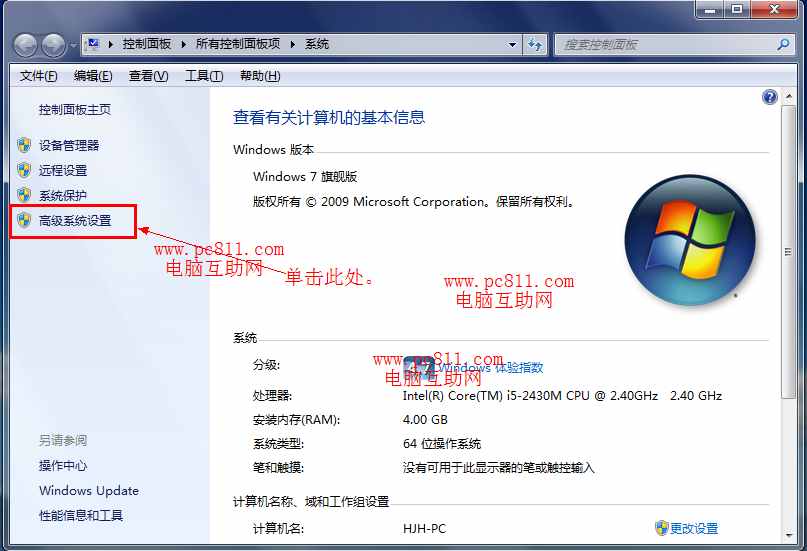 第1步:直接在WIN7系统桌面上找到【计算机】图标,并在此图标上右键选择属性,即可打开系统程序,并在打开的系统程序窗口中单击左侧的【高级系统设置】。