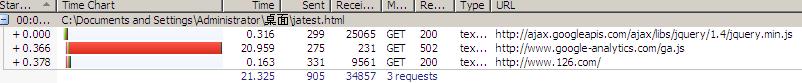 下面的代码使用jquery在document.ready发送1个ajax请求(请求126.com)。测试前修改host文件,让ga的js无法加载: