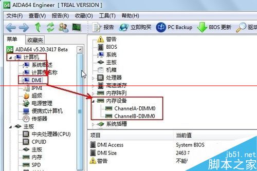4、其实到这里小编还是有怀疑的 有时候cpu-z检测到的内存槽数量和实际的内存槽数量并不相同 网上也有类似的疑问,所以小编又下载安装了AIDA64,打开AIDA64选择“计算机”——“DMI”——“内存设备”我们可以看到两个芯片图片 后面跟着ChinnelA-DIMM0和 ChinnelB-DIMM0 可以确定我们有两个内存插槽