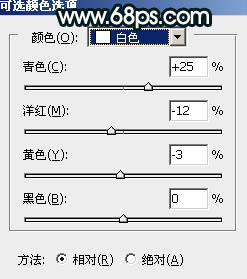 4、创建可选颜色调整图层,对黄、绿、青、白进行调整,参数设置如图4 - 7,效果如图8。这一步主要把图片中的黄绿色转为橙黄色。