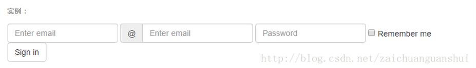 <form class="form-inline" role="form"> <div class="form-group"> <label class="sr-only" for="exampleInputEmail2">Email address</label> <input type="email" class="form-control" id="exampleInputEmail2" placeholder="Enter email"> </div> <div class="form-group"> <div class="input-group"> <div class="input-group-addon">@</div> <input class="form-control" type="email" placeholder="Enter email"> </div> </div> <div class="form-group"> <label class="sr-only" for="exampleInputPassword2">Password</label> <input type="password" class="form-control" id="exampleInputPassword2" placeholder="Password"> </div> <div class="checkbox"> <label> <input type="checkbox"> Remember me </label> </div> <button type="submit" class="btn btn-default">Sign in</button> </form>