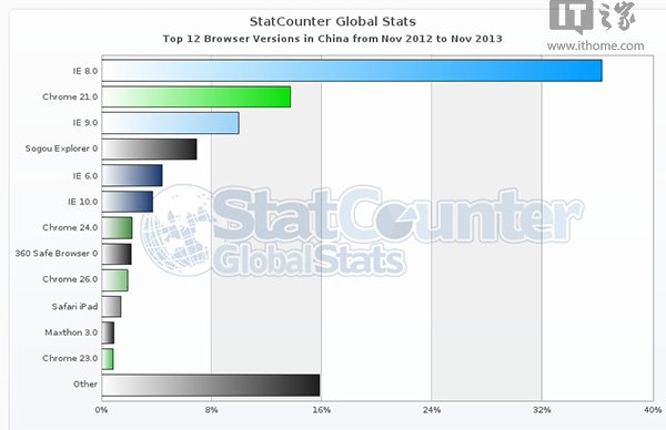 新版浏览器表现十分惨淡,IE10的市场份额仅为3.69%,Chrome 26市场份额更低,为1.88%。