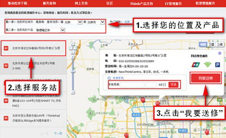 进入如下页面,并从左上角选择您所在位置及产品信息,左侧列表中选择您希望送修的服务站,此时在右侧弹出的信息框中,(您可以通过填写您的手机号码及验证码,将服务站信息以短信方式发送到您的手机上),点击“我要送修”按钮;