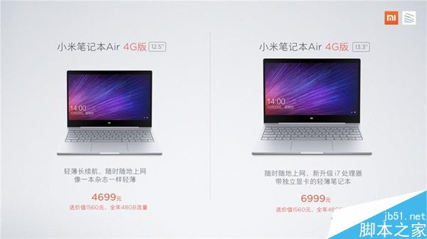 小米笔记本Air 4G有两个版本,高配版拥有13.3英寸屏幕,搭载英特尔i7处理器,配独立显卡,售6999元;低配版拥有12.5英寸屏幕,搭载英特尔Core M3处理器,集成显卡,售4699元。两个版本的小米笔记本Air 4G均附送1560元的流量包,每月赠送4GB流量,全年赠送48GB流量。