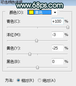 2、创建可选颜色调整图层,对黄色,绿色进行调整,参数设置如图2,3,效果如图4。这一步把背景中的黄绿色转为青绿色。