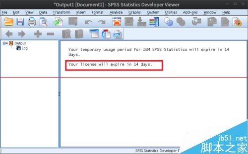 7、在终端中运行 cd /opt/IBM/SPSS/Statistics/22/bin进入程序所在目录,然后运行 ./spssclient打开软件,这时已经可以运行SPSS了,不过在弹出的窗口中可以看到使用期只有14天,而且输入中文的话仍然是乱码,下一步需要激活它然后解决中文乱码的问题。