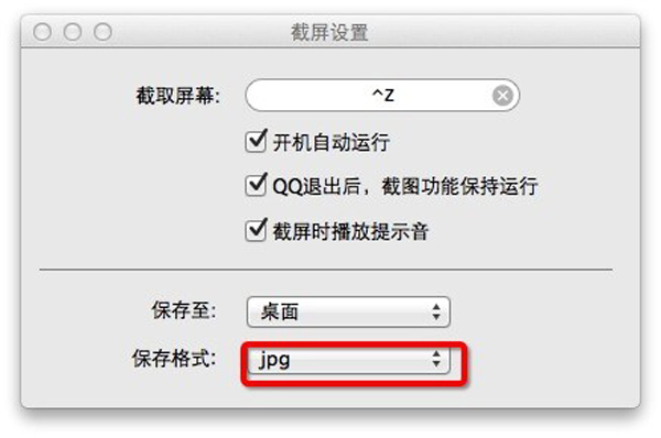 同时你还可以设定QQMac版截屏的图片保存格式,有:png、bmp、gif、jpg、jpg2000以及tiff。一般情况下默认为Png格式的,甚至苹果Mac OS系统自带的截屏工具都是保存为png格式的。至于大家使用的话最好是设置为jpg格式,图片清晰且占据的空间不大。