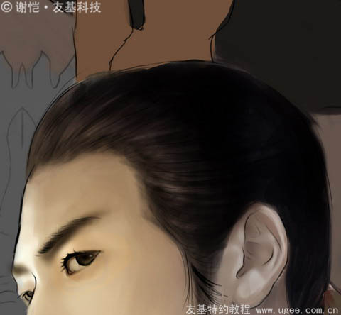 6、因为曹丕称帝的时候已经过了而立之年,所以我给他设计了胡子,让他看起来成熟一些。用上述同样的方法把胡须画完,这样整个脸部就算完成了。这时候我发现耳朵和脖子的颜色有点偏亮,跟脸部的颜色比起来不太协调,不过没关系,先放着,我们最后再来处理这个问题。