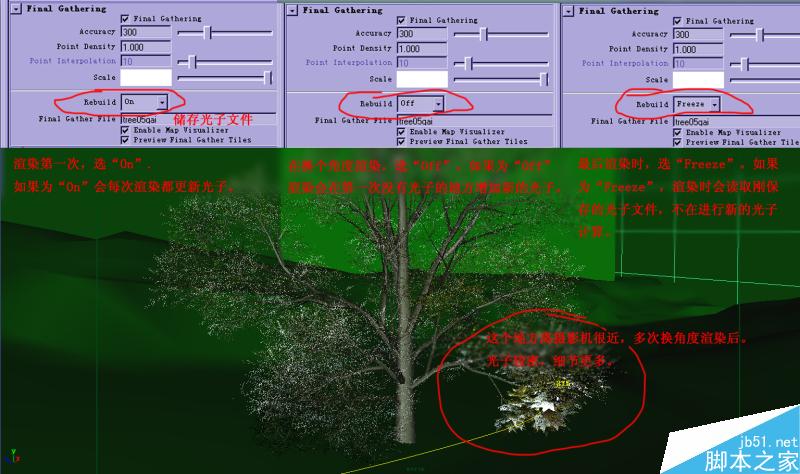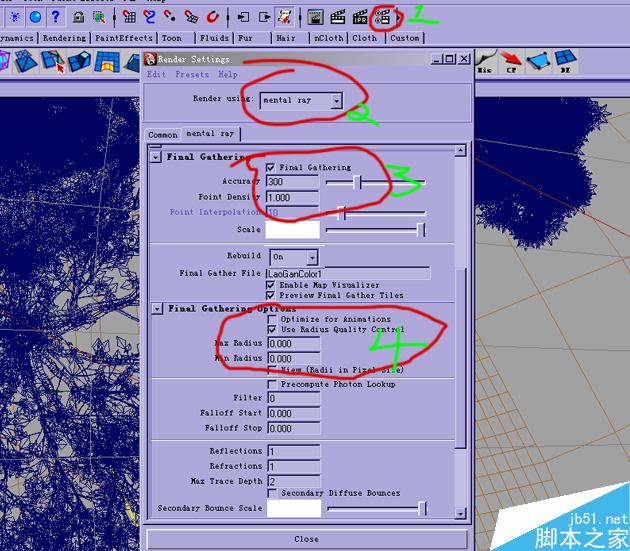(02)在render settings面板里,把render using换成(mentalray)渲染方式。打开final gathering: