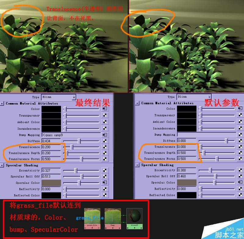 这个材质也可直接给草,让草看上去有更多的细节。translucence和translucence focus,可以控制材质的通透度,有点像3s效果。