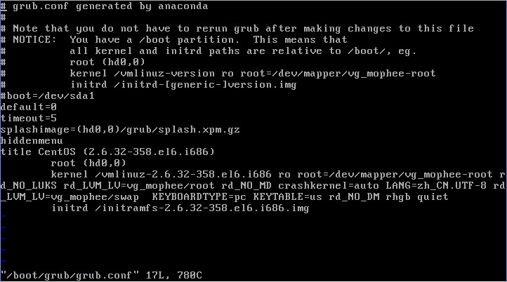 vi /boot/grub/grub.conf #打开 grub.conf