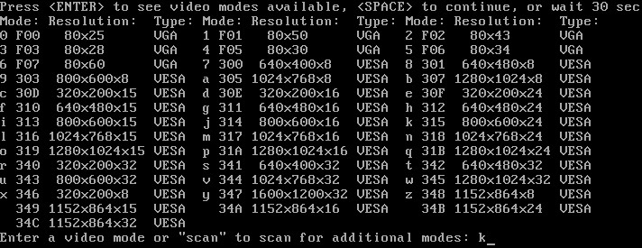 如上图,重启后会首先显示第一行,按ENTER键后显示系统支持的分辨率。这里输入 k ,即分辨率将调整为800×600×24,还有,请记住k后面的数字:315(如果不想每次都这么选择的话,进入系统后再将vga=ask,改成vga=315)