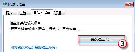 3、在打开的区域和语言框中的【键盘和语言】选卡下,点击【更改键盘】;