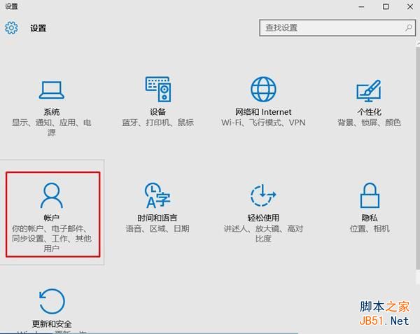 1、按下“Win+I”组合键呼出“设置”,点击“账户”;