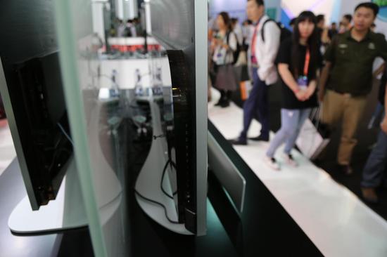 北京时间5月26日下午消息,在上海举办的CES Asia电子消费展上,乐视首次展出了其第三代超级电视X55/Max65。55寸乐视第三代超极电视X55和65寸Max65均采用Open Cell一体化机身设计,使用阳极氧化铝超窄铝合金边框以及金属拉丝纹理聚碳酸酯后壳,而主板电路等接口位置使用茶色透明塑料材料包裹。