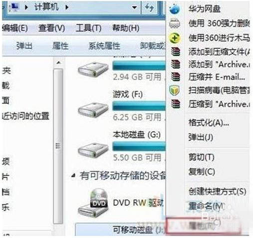 2、 将U盘插入到电脑USB接口中,打开选择U盘右键,选择属性