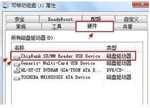 3、 在U盘属性对话框中,会有一个***** USB Device项(不同的U盘有不同的名称),点击选中再点击底部的“属性”,进入***** USB Device属性