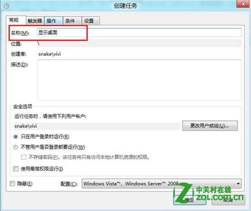 10、在名称对话框中填写任务名称,如显示桌面;