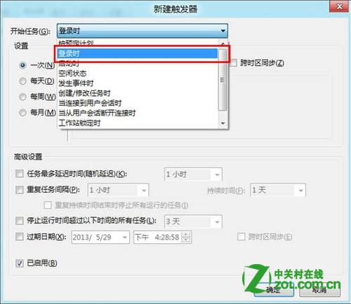 12、开始任务选择“登录时”,点击确定;