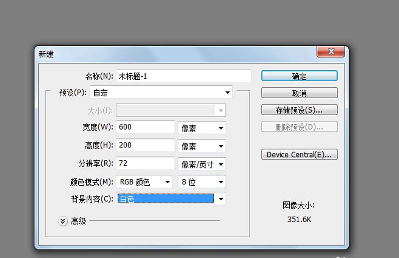1、首先启动Photoshop cs5,执行文件-新建命令,新建一个大小为600*200,分辨率为72,背影颜色为白色的文档。