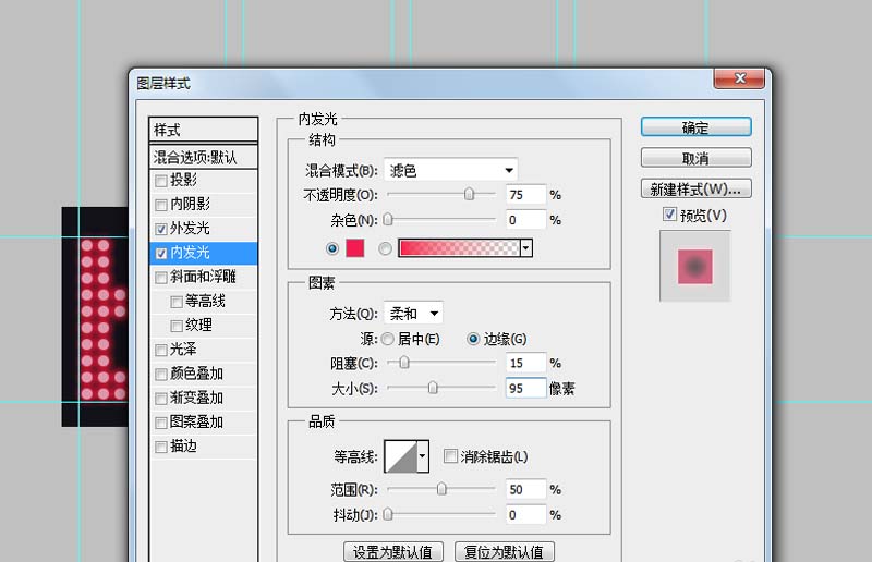 5、双击图层1副本调出图层样式对话框,勾选外发光,设置颜色为红色,扩展为5,大小为10,勾选内发光,设置颜色为浅红,设置阻塞15,大小为95.